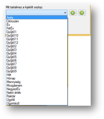 A jobb oldali táblázatban találjuk a betöltött táblák tartalmát. A táblába megadható oszlop adatok: ügyfél, év, félév, negyedév, hónap, hét, nettó érték, mennyiség, árrés, cikkszám, gyűjtő , raktár, ügyintéző, mozgás.