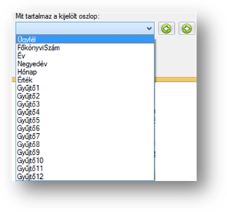 A jobb oldali táblázatban találjuk a betöltött táblák tartalmát. A táblába megadható oszlop adatok: ügyfél, főkönyvi szám, év, negyedév, hónap, érték, gyűjtő (12 gyűjtő mélységig).