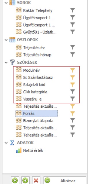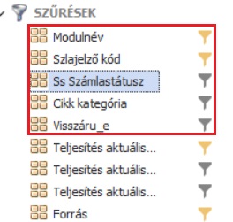 Szűrőbe a kötelezően és ajánlottan használandó szűrőket mindenképp alkalmazzuk. (pl.: Tétel: Modulnév, Számlajelző, Számlastátusz, esetleg Cikk kategória, Visszáru-e, Forrás, amennyiben van terv betöltve stb)