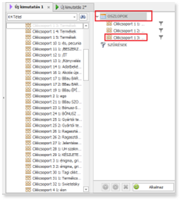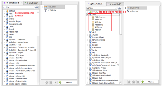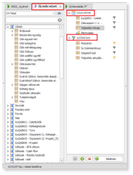 A bal oldali mező fa struktúrába kattintva, a keresendő mező nevét begépelve (%-kal kezdve, ami tartalmazza a beírt karaktereket, vagy % nélkül, amivel kezdődik a keresett mező) a keresés megmutatja kiinduló csoport utáni első találati mezőt.