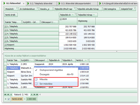 Az Összegzés/Lefúrás/Lefúrás cellára táblázatok celláinak másolása helyi menüvel érhető el. Külön menüponttal lehet cellát vagy egy egész sort másolni.