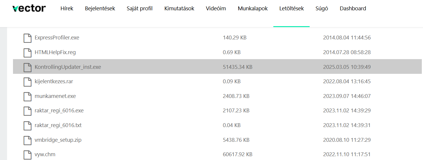Az Updater program telepítője a Vector Kft. terméktámogatási weboldalán bejelentkezve a Letöltések menüpont alatt érhető el, ahol KontrollingUpdater_inst.exe néven találjuk meg.