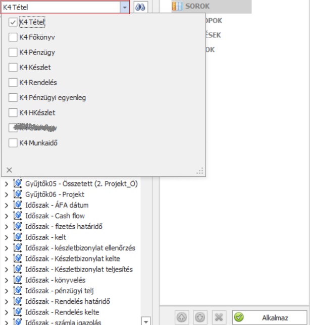 Sorokba azokat a mezőket húzzuk, amelyek alapján soronként (egymás alatt felsorolva) szeretnénk látni az érték mezőket. Jellemzően azok a típusú mezők ajánlottak sorban megjeleníteni, melyekből az adatbázisban nagy számot képviselnek (cikk, cikkcsoport, készletkód, ügyfél, ügyfélcsoport, bizonylatszámok, stb.)