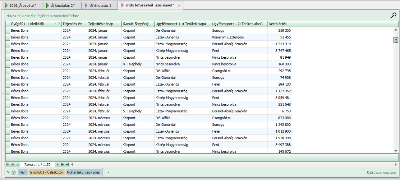 Az összeállító felületen kiválasztott mezők tartalma az alkalmazott szűrésekkel ebben az ablakrészben jelennek meg