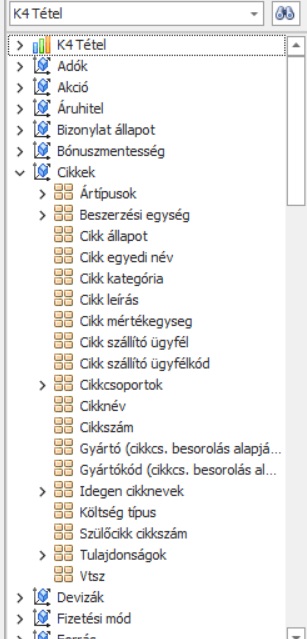 Témakörökhöz kiválasztható mezőcsoportok struktúrája. Törzsekre, kódszótárakra csoportosítva választhatóak ki tematikusan az elérhető mezők és számszerű adatok.