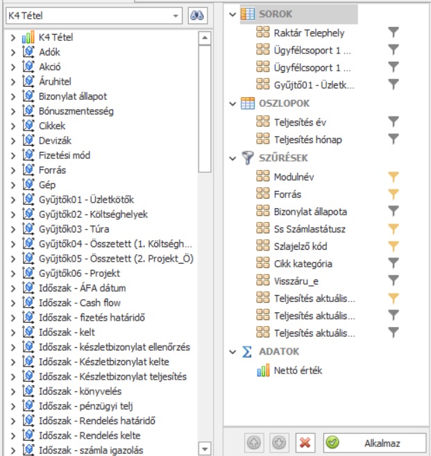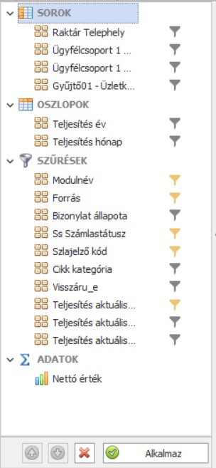 Szűrésekbe azokat a mezőket húzzuk, amelyek a kimutatásban nem szerepelnek majd, de szűrőfeltételt szeretnénk megadni rá. pl.cikkcsoport, időszak, ügyfélcsoport, stb., de a tematkánkét kötelezően vagy ajánlottan használt mezőszűréseket is itt helyezünk el.