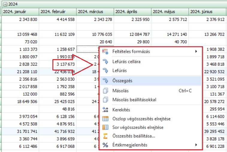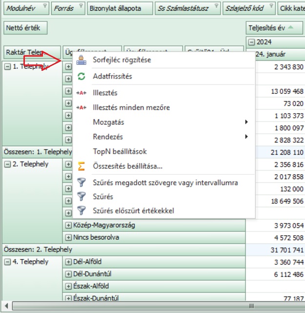 Ebben az ablakrészben mind sorokban, oszlopokba elhelyezett mezőnevekről, illetve az adatokba húzott értékekről indíthatóak helyi menük. A menüpontok jobb klikkes kattintással érhetőek el.