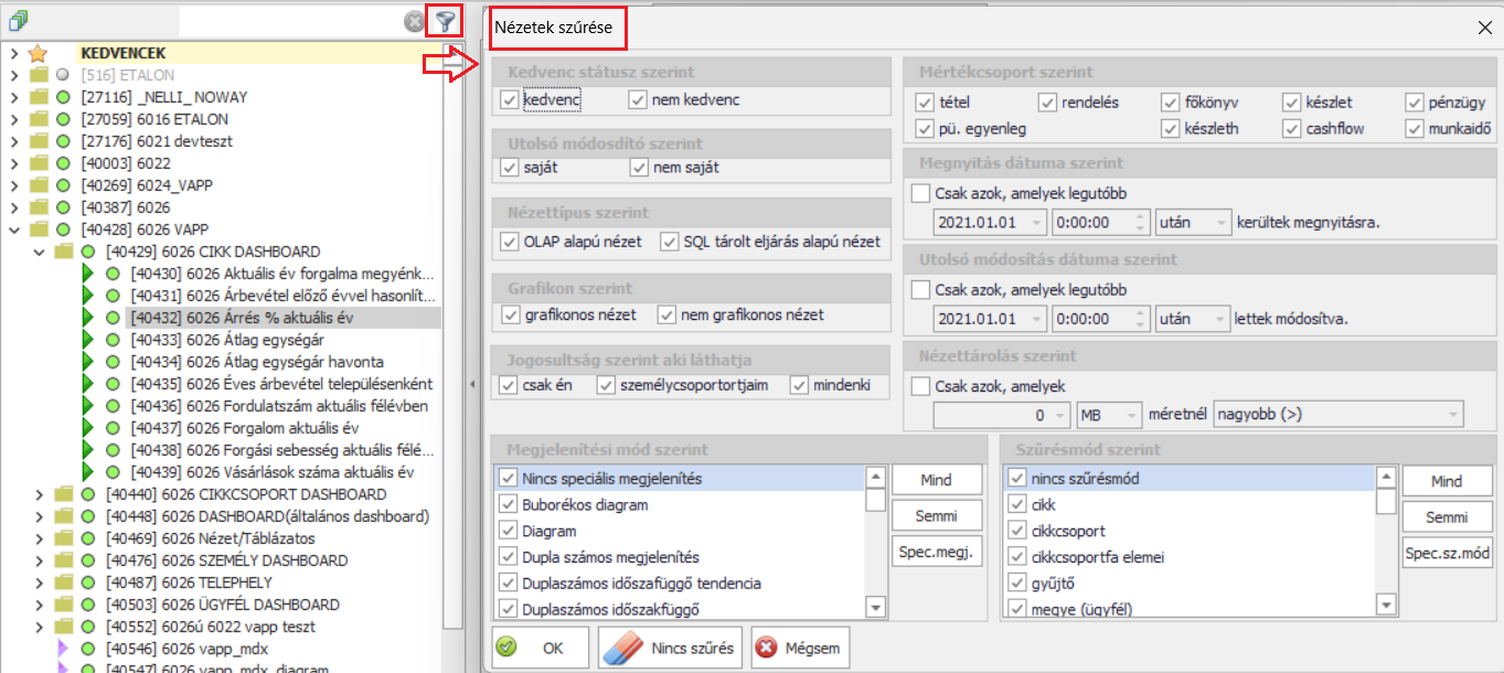 Nézetek szűrése ablak nyújt segítséget kimutatás tematika, speciális megjelenés, módosítás stb. szerinti szűrésére.
