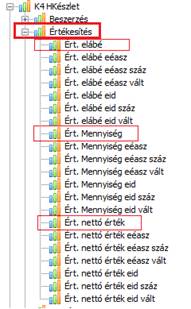 Ez a csoport az értékesítés elábét, az értékesítés értékét nyilvántartási áron és az értékesítés mennyiségét tartalmazza. Mindhárom measure-nél megjeleníthetők az előző éves értékesítés (eéasz), a számított különbség (eéasz vált) a jelenlegi adathoz viszonyítva, illetve ennek százalékos aránya (eéasz száz) heti és havi vonatkozásban is (tehát a megelőző év azonos szakában).