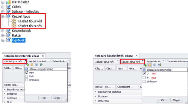 Az új készlet modulban új dimenzióként található meg a Készlet típus dimenzió, mely a Készlet típus név és Készlet típus kód mezőket tartalmazza. Ezen mezők egyikét (!) kötelező szűrőként kell alkalmazni kimutatás összeállításakor a modulban helyes működéséhez. A szűréssel lehet elirányítani az összeállított kimutatást, hogy az adatokat heti vagy havi szinten akarjuk elemezni.