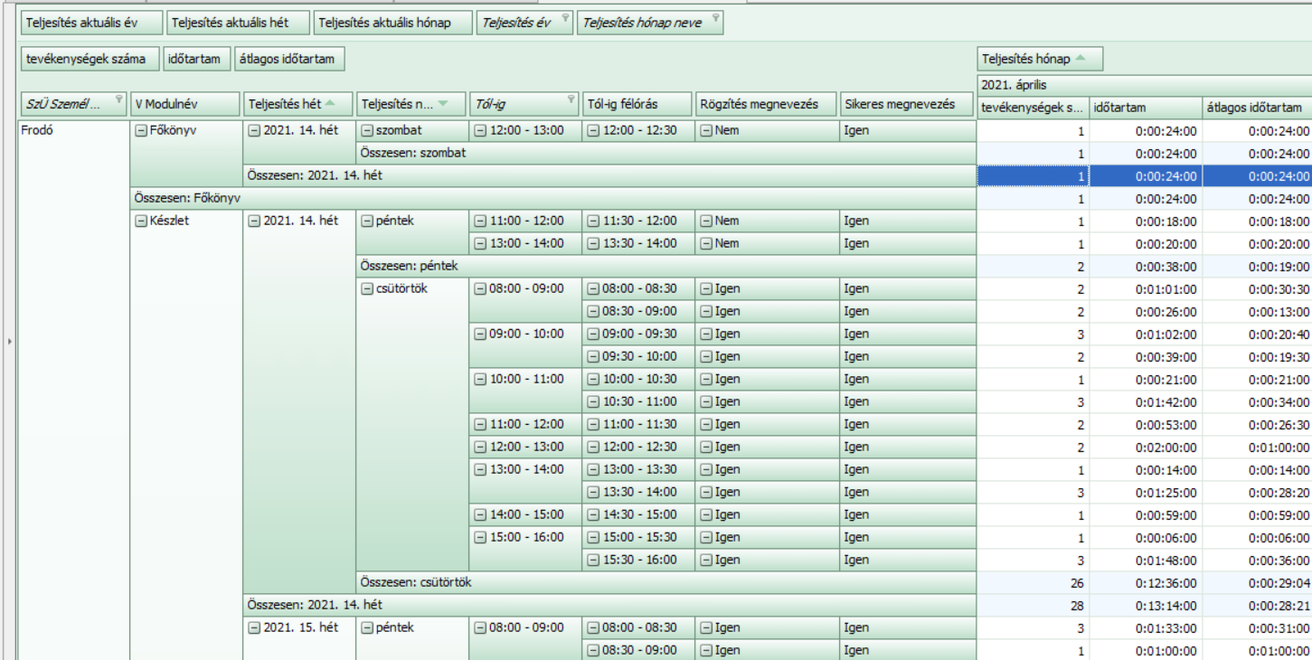 A Munkaidő tematika adott modulban rögzítéssel és/vagy módosítással eltöltött időtartamot tevékenység számát esetlegesen bizonylatokon szereplő tételszámok részletezését monitorozza. A kimutatás számos szempont alapján rendezhető, csoportosítható, szűrhető. Telephelyenként, felhasználónként éves, havi, heti napi esetlegesen órás/félórás bontásban jeleníthető meg a munkaidő eloszlása.