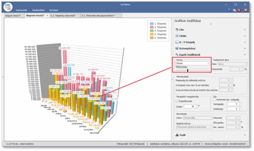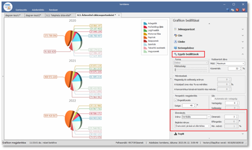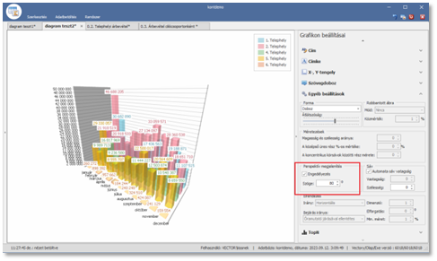 Az egyéb beállítások résznél állítható lett a perspektiv megjelenítés, aminek a 3D-s grafikonoknál van jelentősége. Ezzel szabályozható a perspektivitás szöge, amellyel szinte axonometrikussá is tehető a diagram, vagy éppen intenzívebb rálátású perspektiv megjelenést is adhatunk.