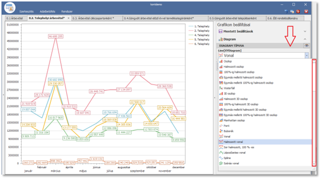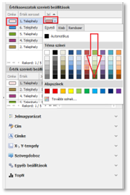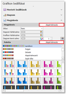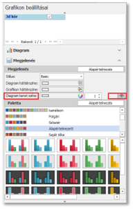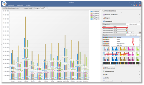 A diagram megjelenítését mostantól egy új gyári megoldással is hangolhatjuk, az ún. palettával. Ez lehetőséget ad arra, hogy ne elemenként (pl. oszloponként, vonalanként) állítsunk színt a grafikonon, hanem témák szerint és ezen belüli megjelenítések szerint lehet egy mozdulattal teljes színskálát alkalmazni.