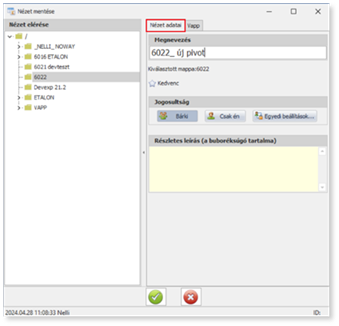 A Nézet adatai fülön van lehetőség megadni a nézet nevét, jogosultsági beállításokat, esetleges buboréksúgó szövegét, illetve a nézetet itt is kedvenccé lehet tenni már mentéskor. A mentés helyeként bal oldali mappa struktúrából kiválasztott mappa neve is látható.