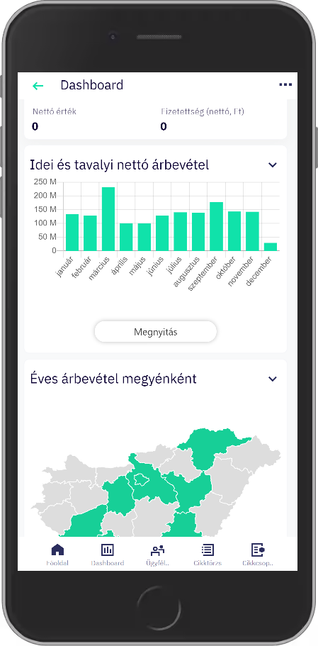 A Dashboard komponensen ugyan nincsenek szűrők, a Cikktörzs, Ügyféltörzs, stb. komponenseken már van valamilyen adat, amire szűrnünk kell a widgetek értékét.
